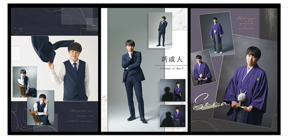 二十歳の装いを10枚以上のお写真に組み合わせて1冊の特別なデザインアルバムをおつくりします。